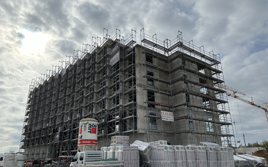 Neubau eines Hotels mit sechs Geschossen in Massivbauweise und einer Fußgängerbrücke (Stahlbau) als Zubringer zu einer Eventhalle
